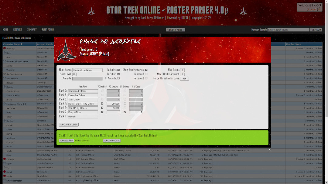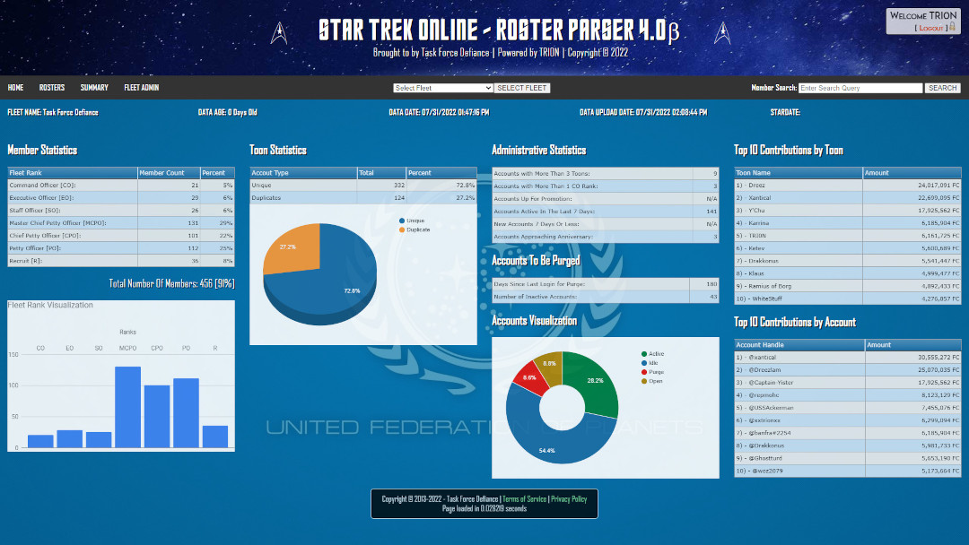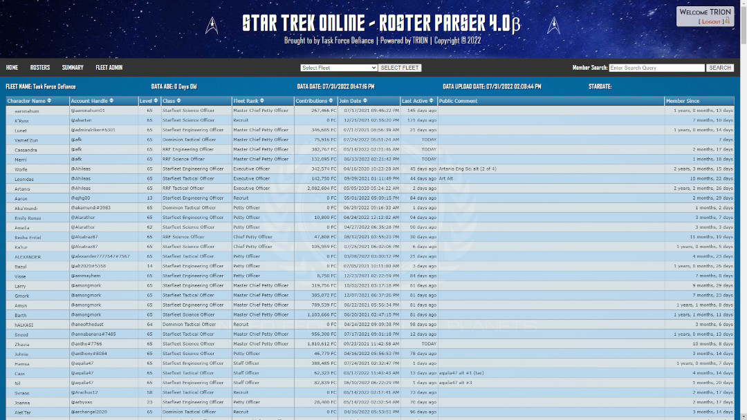 What's so amazing about it? Well, what you don't see beyond the Public Roster Listings is that it has many useful features to manage your members and fleet. It's amazing what you can do with that dinky CSV Export that Star Trek Online paid little attention to. Examples would be that it can identify promotions for members, anniversaries, point out possible purge records based on inactivity and give you a complete summary of your fleet from a perspective that you have not seen before.